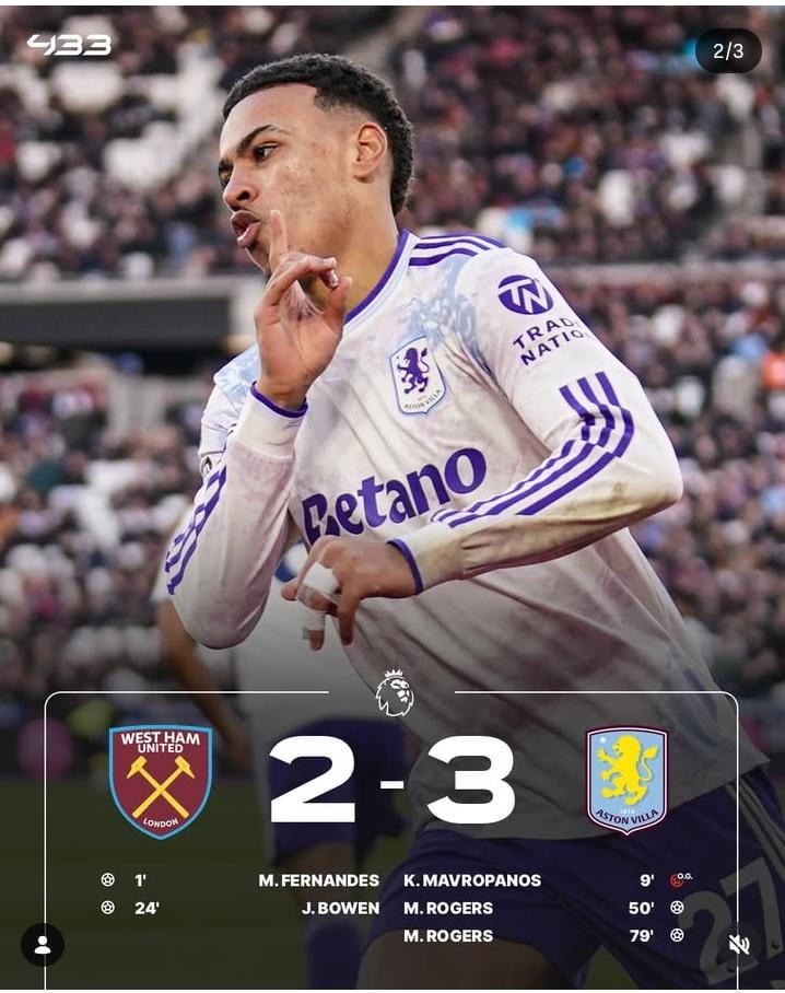 Aston Villa meraih kemenangan dramatis dengan skor 3–2 atas West Ham United dalam laga yang berlangsung sengit. Bermain di hadapan pendukung West Ham, Villa tampil efektif dan mampu membalikkan keadaan melalui permainan cepat dan penyelesaian klinis.
